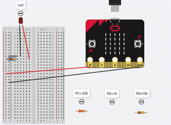 Materiali: Micro:bit + Shield, Breadboard, LED Rosso, Resistenze (220, 1k, 10k), cavetti F-M (Femmina-Maschio) per collegare Shield a Breadboard.