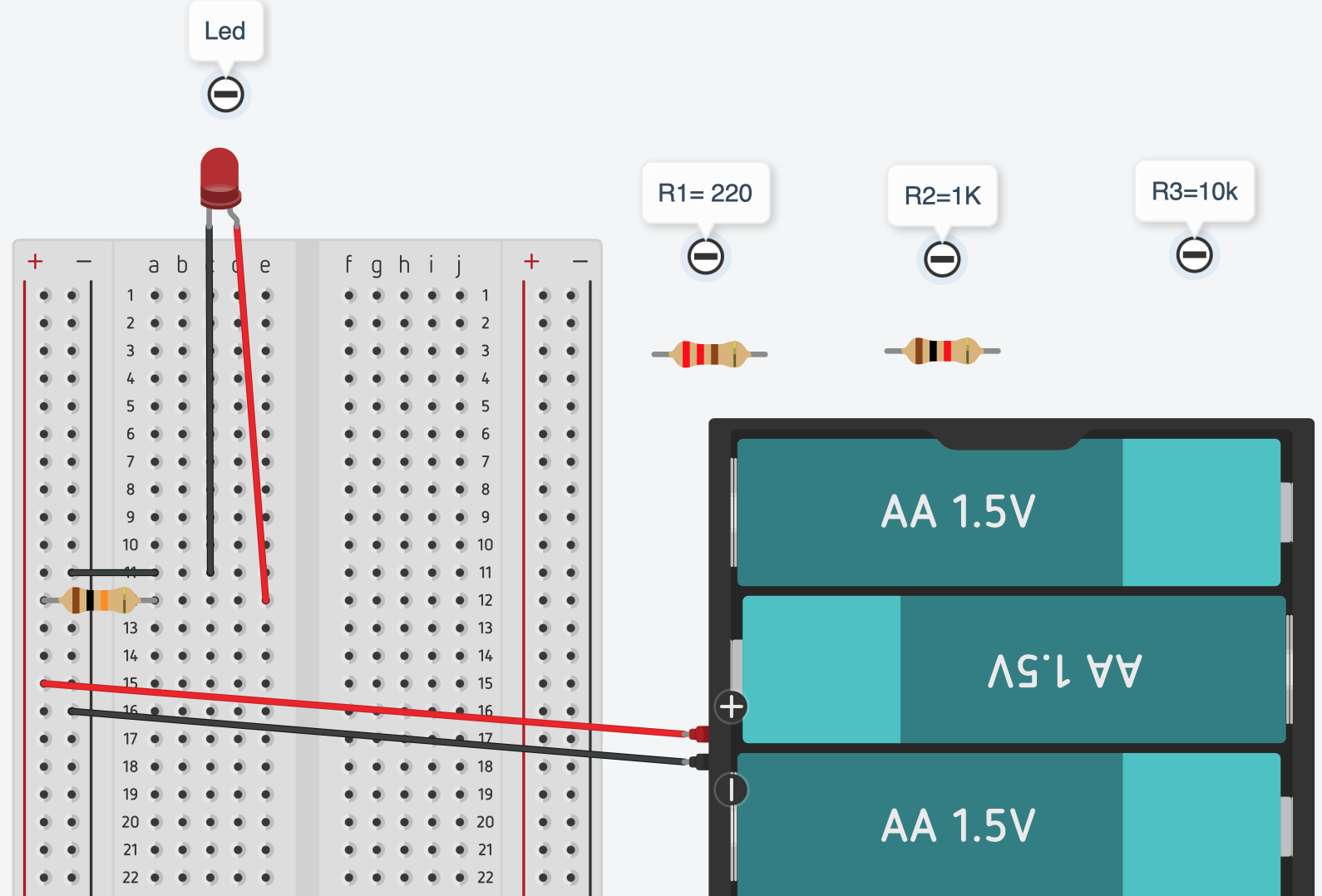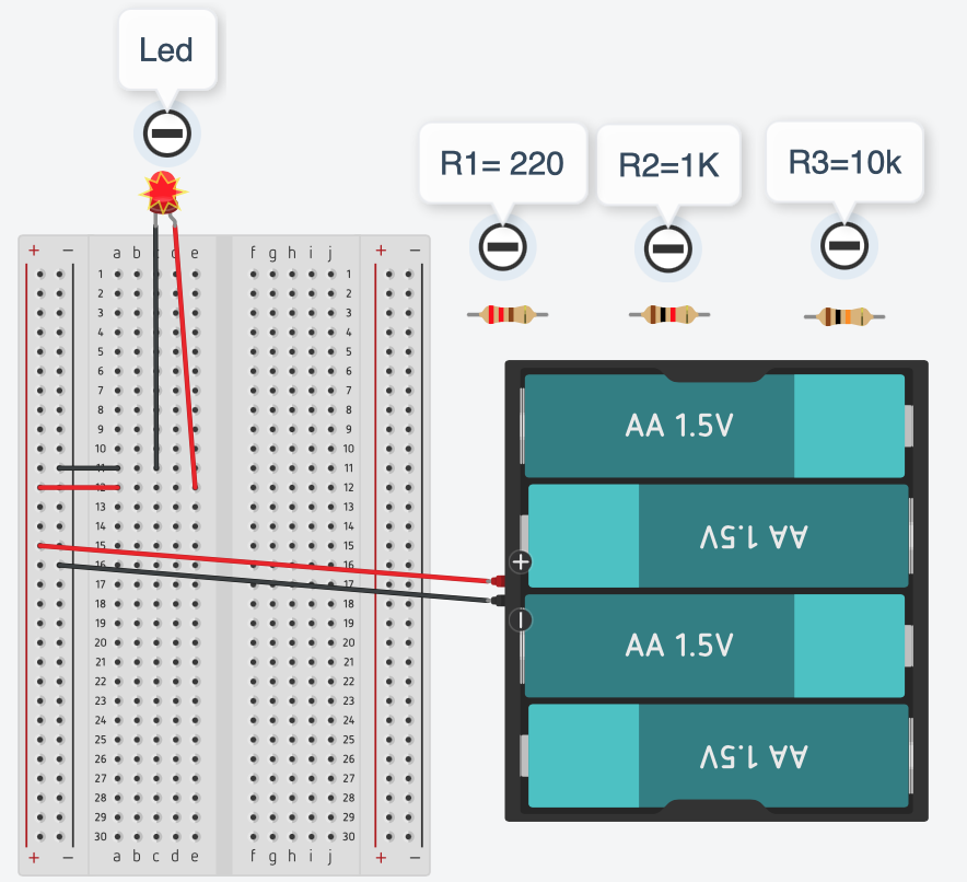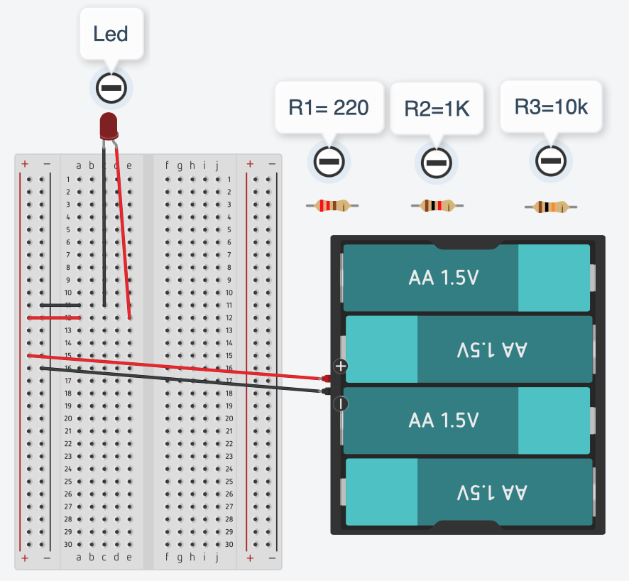 - Componenti: Breadboard, Battery Holder (4xAA o 6xAA), Red LED, Resistenze varie (220Ω, 1kΩ, 10kΩ).